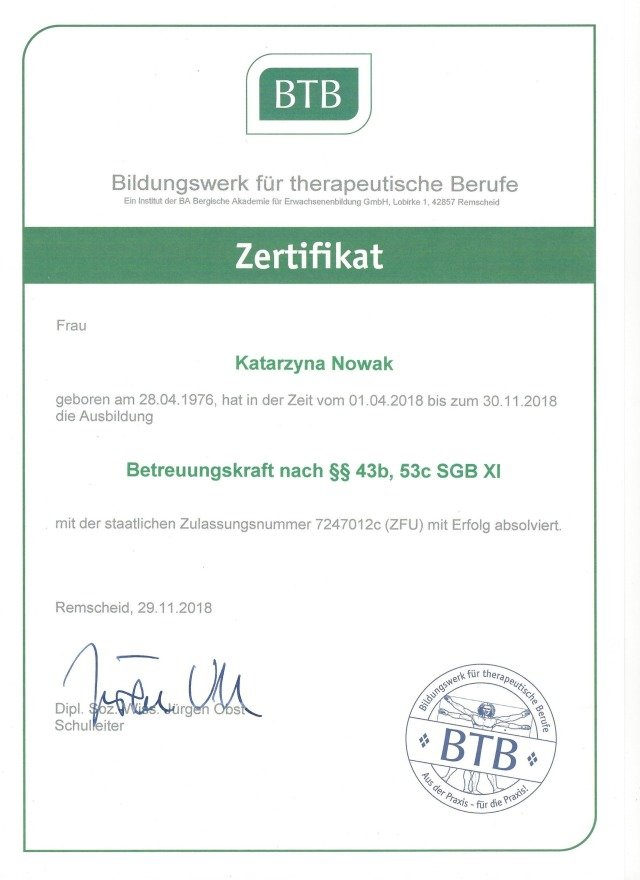 Mein Name ist Katarzyna Nowak, Jahrgang 1976, Verheiratet und eine stolze Mama von 2 (fast) erwachsenen Söhnen. Da ich die letzten Jahre für meine Kinder da sein wollte habe ich mich auf Basis geringfügiger Beschäftigung (Minijob) um ältere Menschen gekümmert.